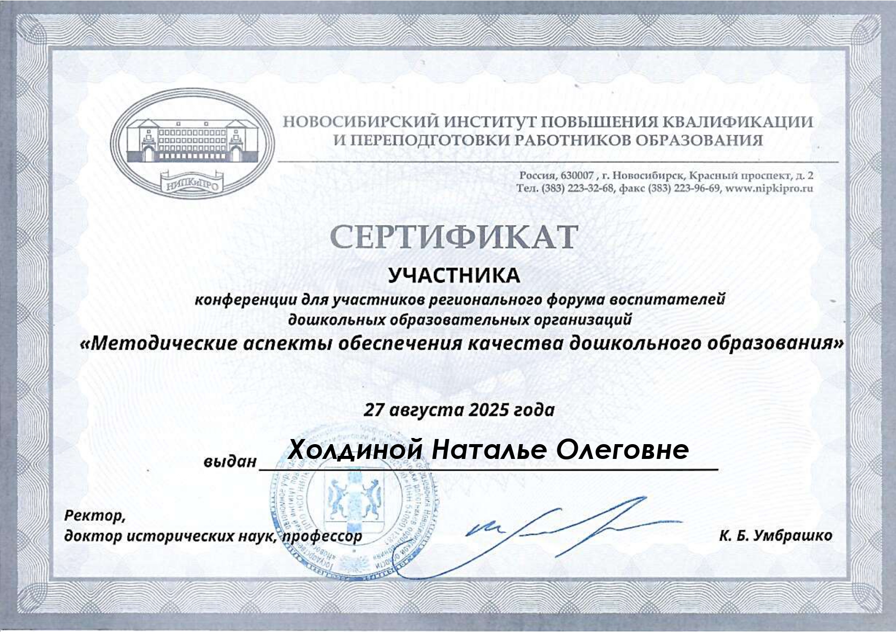 Сертификат Методические аспекты обеспечения качества дошкольного образования