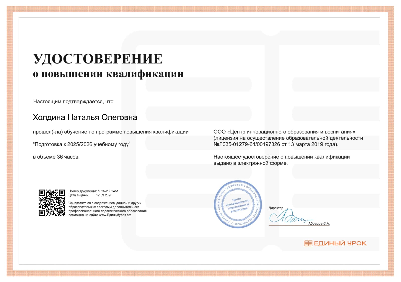 Удостоверение о повышении квалификации "Генеративный искусственный интеллект для преподавателя: стратегии, инструменты, этика"
